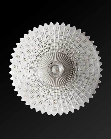 Il piatto presenta una serie di piccoli quadretti disposti ad anelli concentrici intorno ad un motivo floreale centrale. La superficie perfettamente piatta indica che questa alzata fu creata per presentare una torta da tagliare in presenza dei commensali. Il bordo è a smerlo. La base a goblet invertito riprende il decoro della parte superiore.