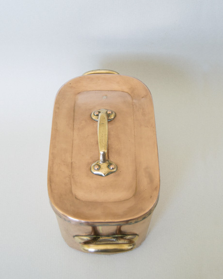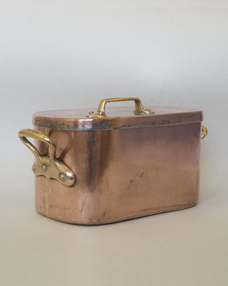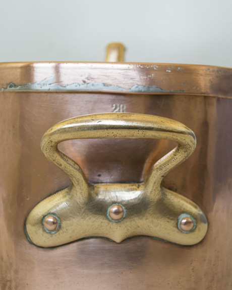 Daubière in rame stagnato con giunture brasate e maniglie in ottone fissate con tre rivetti in rame, completa di coperchio leggermente incassato con manico in ottone fissato con quattro rivetti. Timbrata con il numero 28.