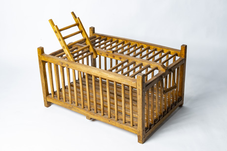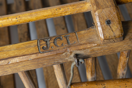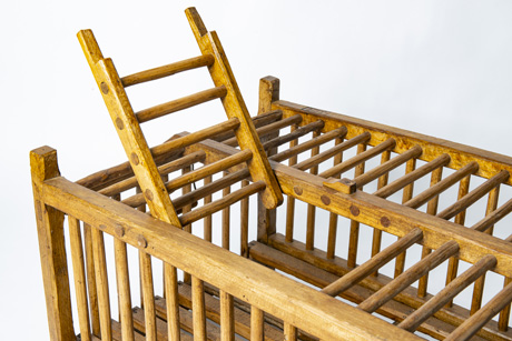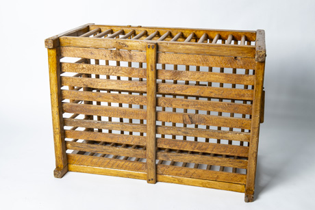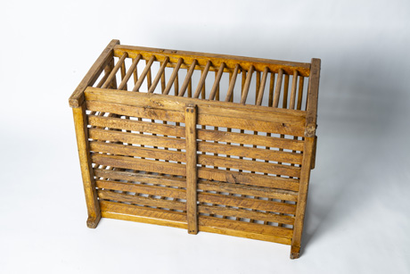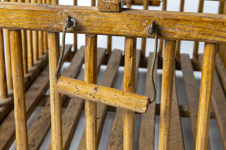 Una gabbia di legno per il trasporto di pollame in eccellenti condizioni con tutti i pioli ben fissati e pannelli di fondo robusti. E’ dotata di maniglie laterali e una porticina con chiusura. Le iniziali J.C.L. sono impresse sul bordo superiore della cornice. Con l’aggiunta di una lastra di cristallo, diventa subito un tavolino. Provenienza: Alta Savoia, Francia.