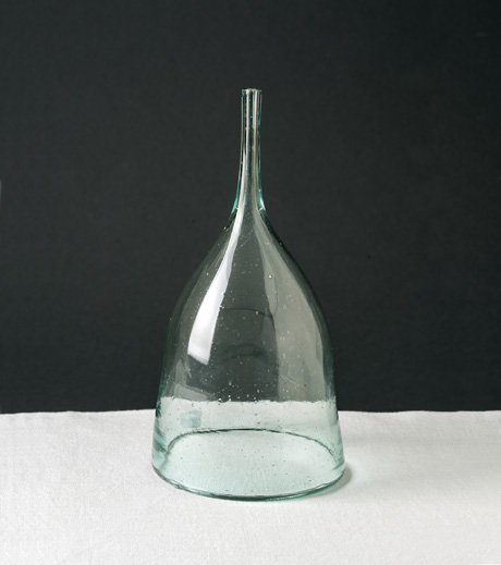 Piccole bolle d’aria e ondulazioni nelle pareti di vetro attestano la produzione artigianale di questo imbuto, utilizzato un tempo per travasi in cantina o in piccoli laboratori. Il collo di questi oggetti mostra spesso i segni irregolari del taglio a mano che li separava perché venivano soffiati in sequenza da un tubo di vetro in comune.
