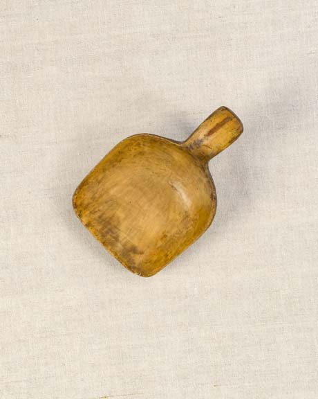 Piccolo mestolo in legno di pero dalla forma quadrata con manico sagomato a gancio. Utilizzato per la gestione di latte e di burro. Fine ‘800. Bellissimo esemplare.