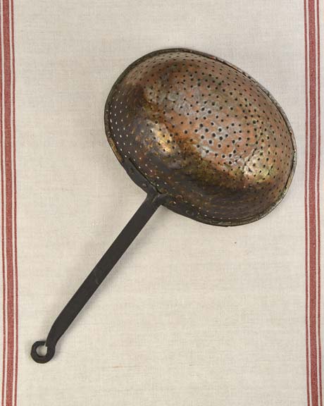 Un esempio di grande mestolo forato (definito anche ramaiolo) dalla originale forma ovale. E’ in rame con manico in ferro ricurvo ad anello all’estremità per poter essere appeso. La grande dimensione fa supporre che potesse essere utilizzato non solo per scolare verdure, cereali e legumi, ma anche come scolapasta. L’esemplare presenta chiari segni di utilizzo e anche una vecchia riparazione nella zona di congiunzione con il manico.