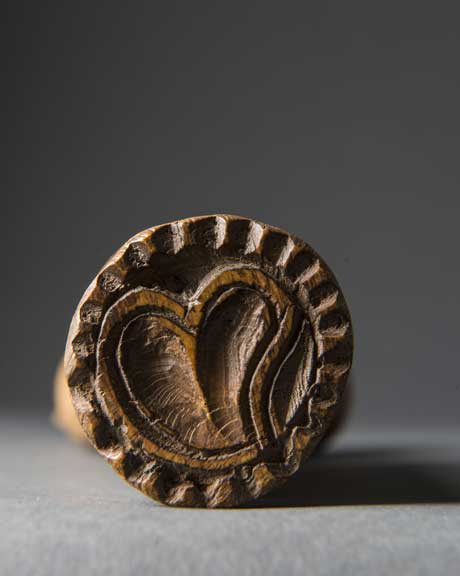 Questo particolare timbro proviene dalla zona ovest dell’arco alpino. Il gallo, simbolo di vigilanza e resurrezione, era ricorrente, così come il cuore, molto presente in tutti i decori alpini.