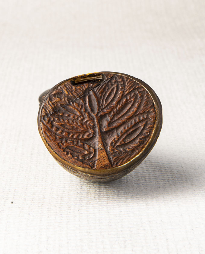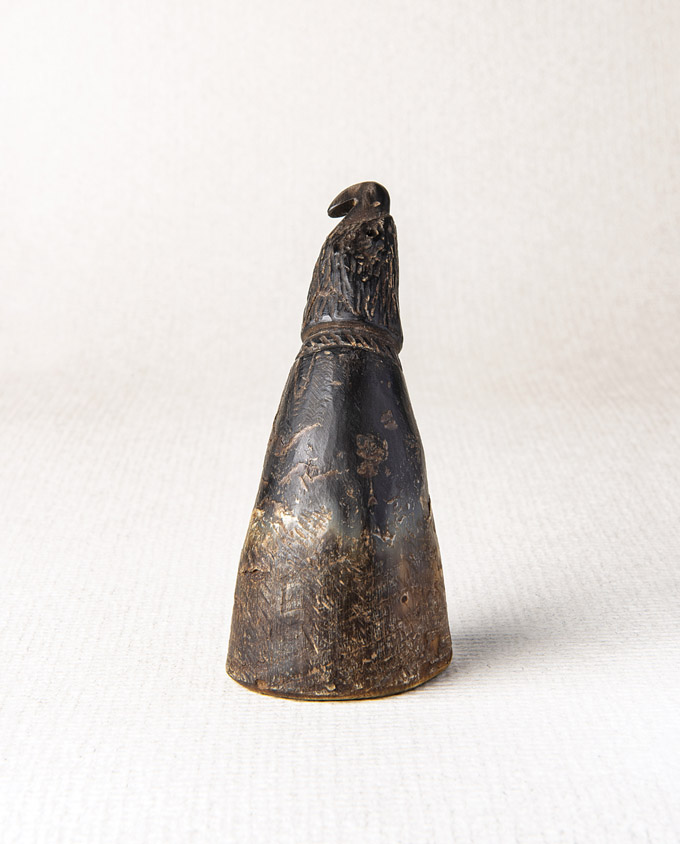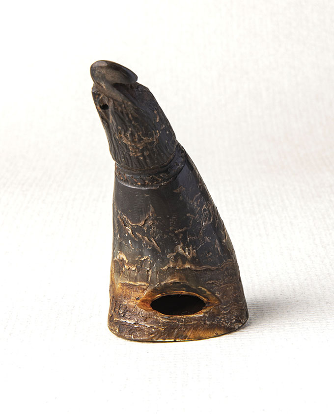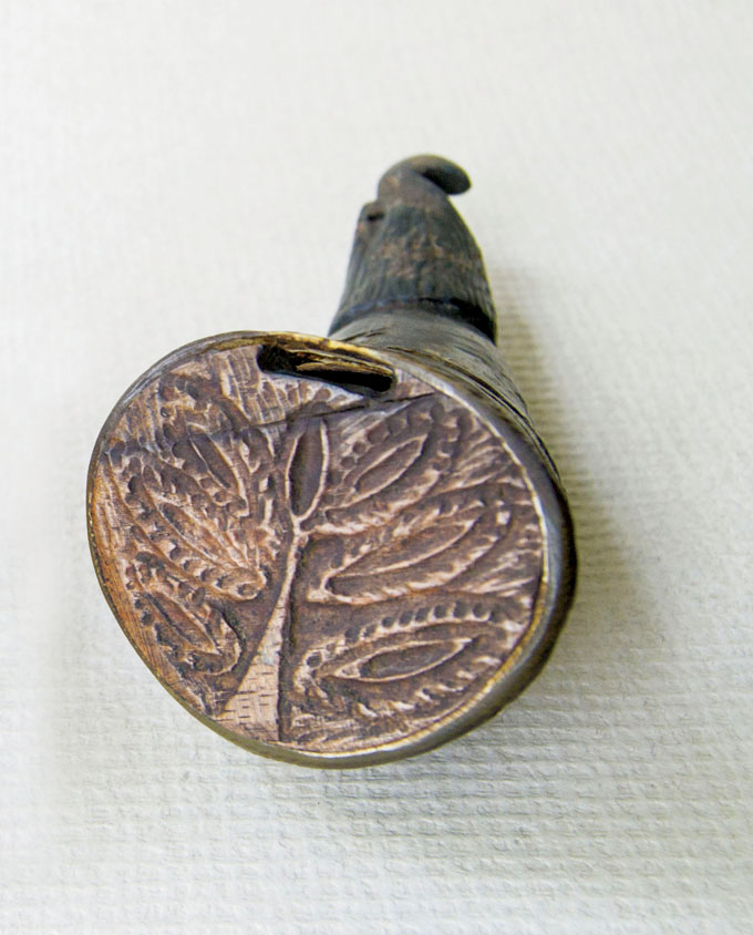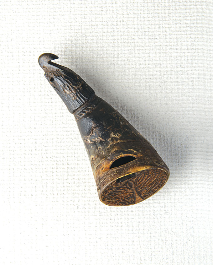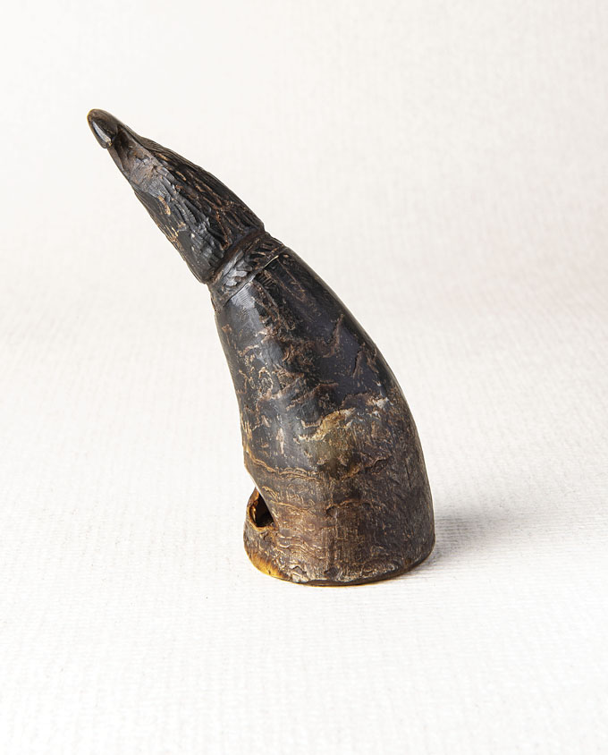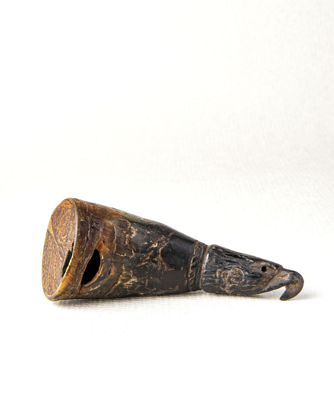 Fischietto in corno e legno. L’estremità appuntita è stata scolpita per assomigliare alla testa di un uccello con il becco ricurvo. L’apertura naturale alla base del corno è stata chiusa con un disco di legno modellato con precisione per adattarsi perfettamente allo spazio. Questo disco è decorato con intagli che raffigurano un albero.
