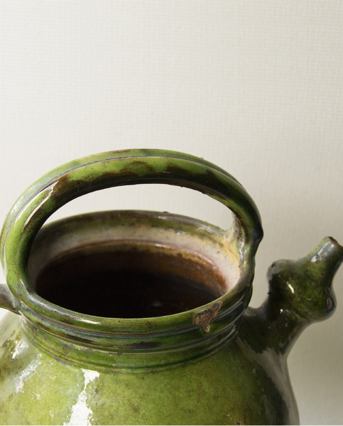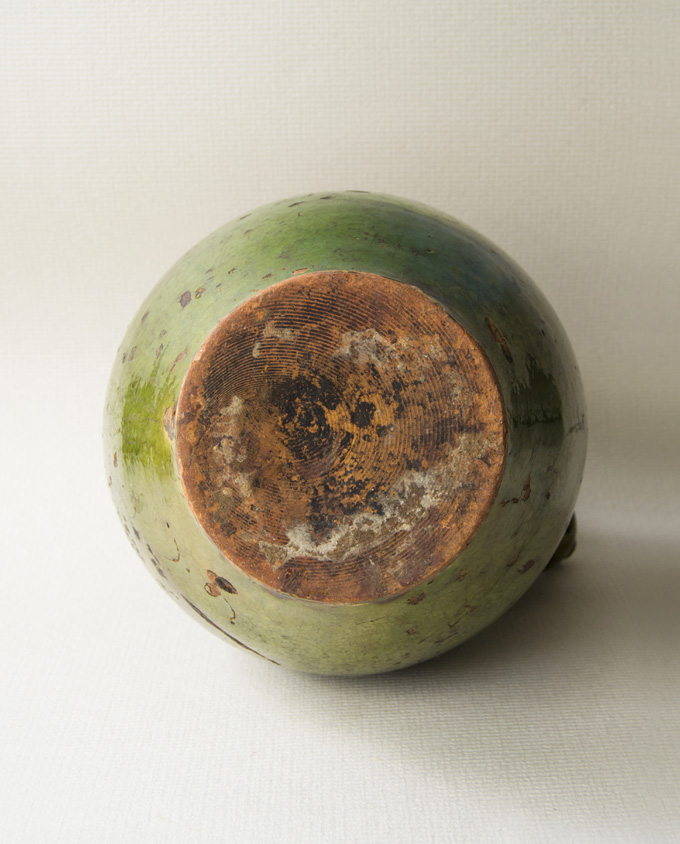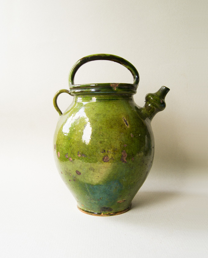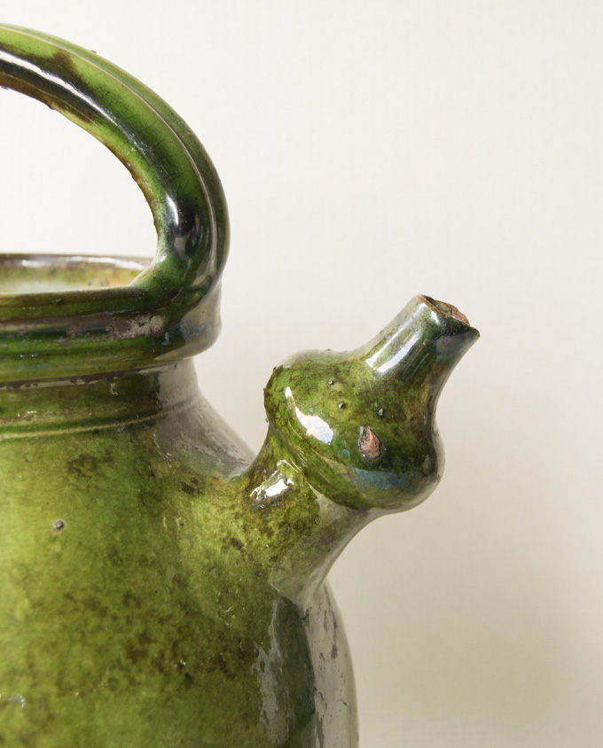 Brocca per l’acqua con i tradizionali manici superiori e laterali e un bello smalto verde screziato. Nell’Alta Savoia questi contenitori avevano capacità comprese tra 1,5 e 10 litri. In generale, le loro condizioni tendono ad essere migliori delle brocche d’olio di forma simile. La caratteristica distintiva è il beccuccio bulboso: permetteva di versare rapidamente l’acqua senza il gorgoglio causato dal riflusso d’aria.