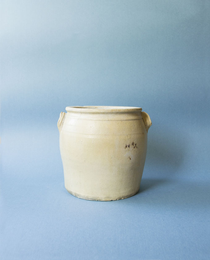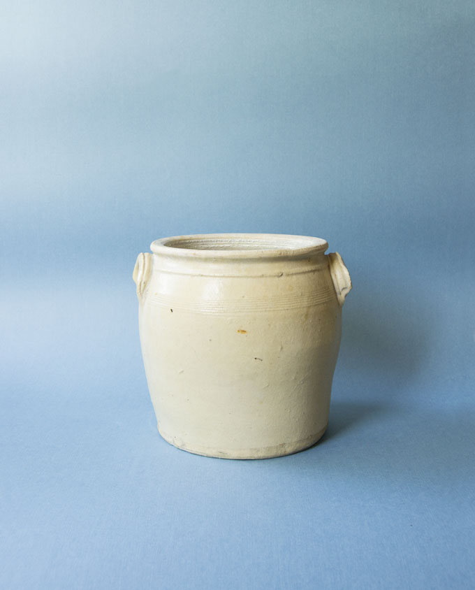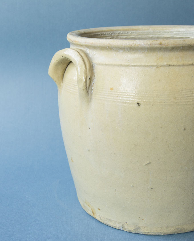 Vaso in gres smaltato originariamente usato per la conservazione di carni sotto sale, in confit o verdure sott’aceto (tipo krauti). Pesanti e a tenuta stagna, questi vasi erano di solito reperiti localmente e spesso recano marchi che ne indicano la capacità in litri. Questo particolare stile di vaso, con smalto grigio e prese curve aderenti, è tipicamente francese. Condizione vintage con qualche minuscola crepa.