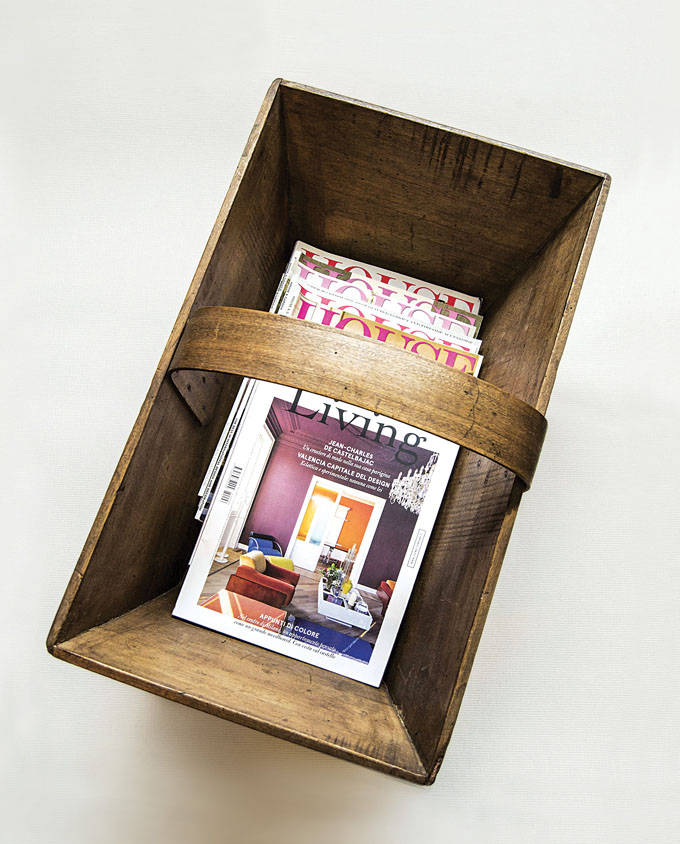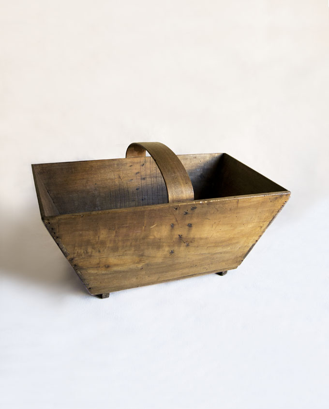 Grande cestino in legno di forma svasata con manico curvo fissato con piccoli chiodi. Posa su due supporti, anch’essi in legno per tenere il fondo sollevato da terra. Perfetto per contenere riviste.