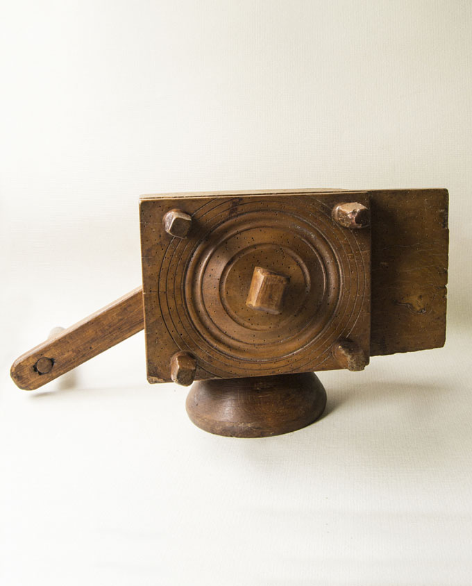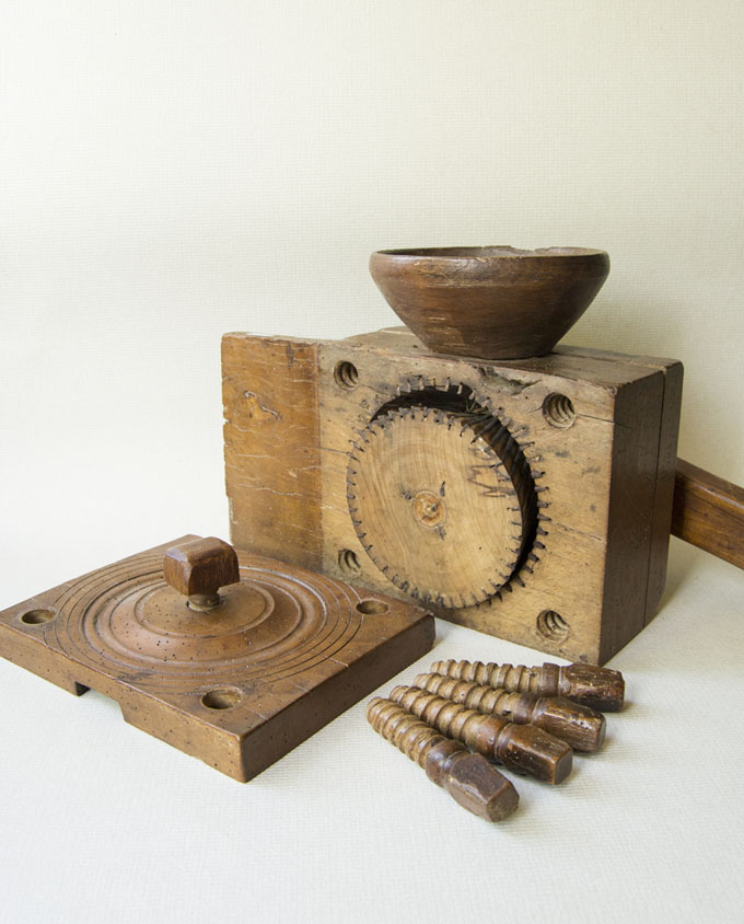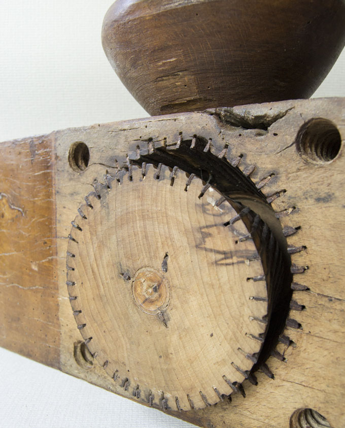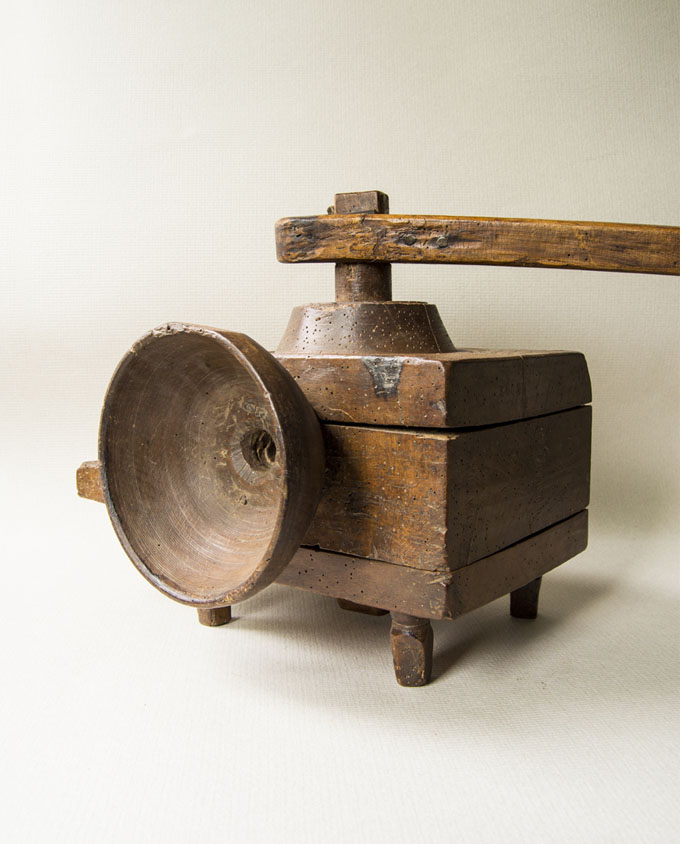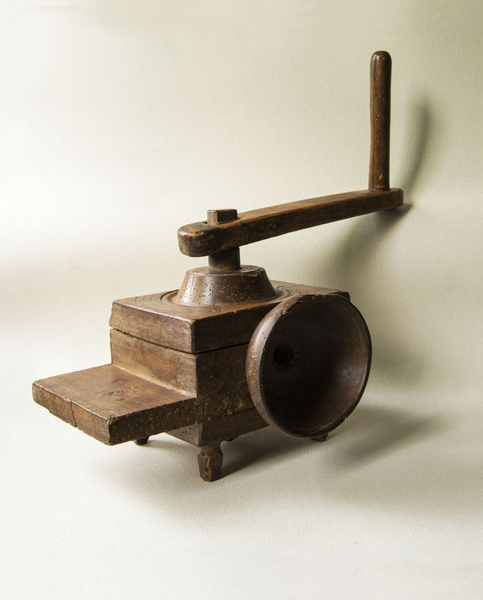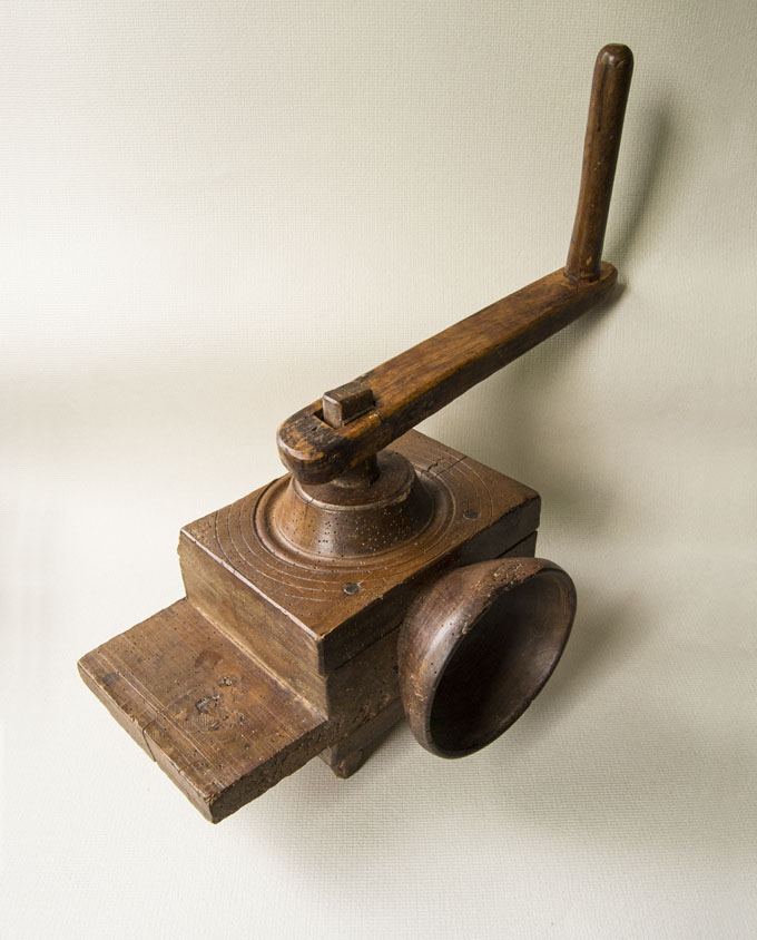 Molto compatto, di solito questo strumento era fissato su una trave in casa o nel fienile. Nonostante le dimensioni ridotte, la sua resa risultava sufficiente per una famiglia. Il grano veniva macinato alla finezza desiderata grazie alla regolazione delle viti di legno poste sul retro e la farina ottenuta era setacciata più volte. Provenienza: Alta Savoia (Francia).