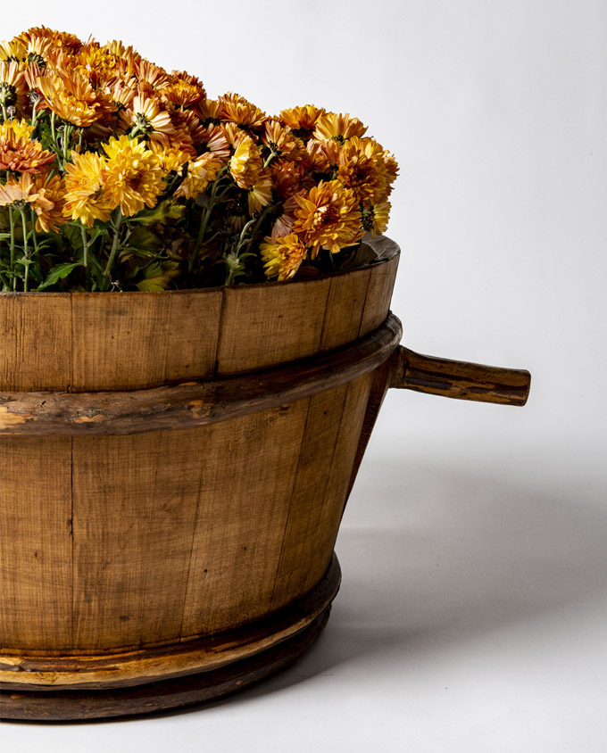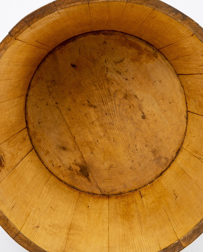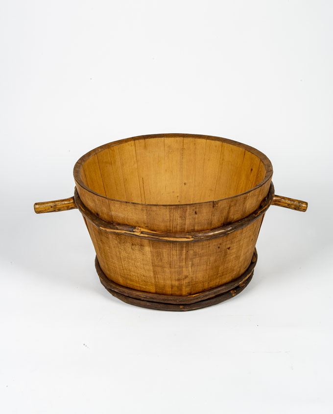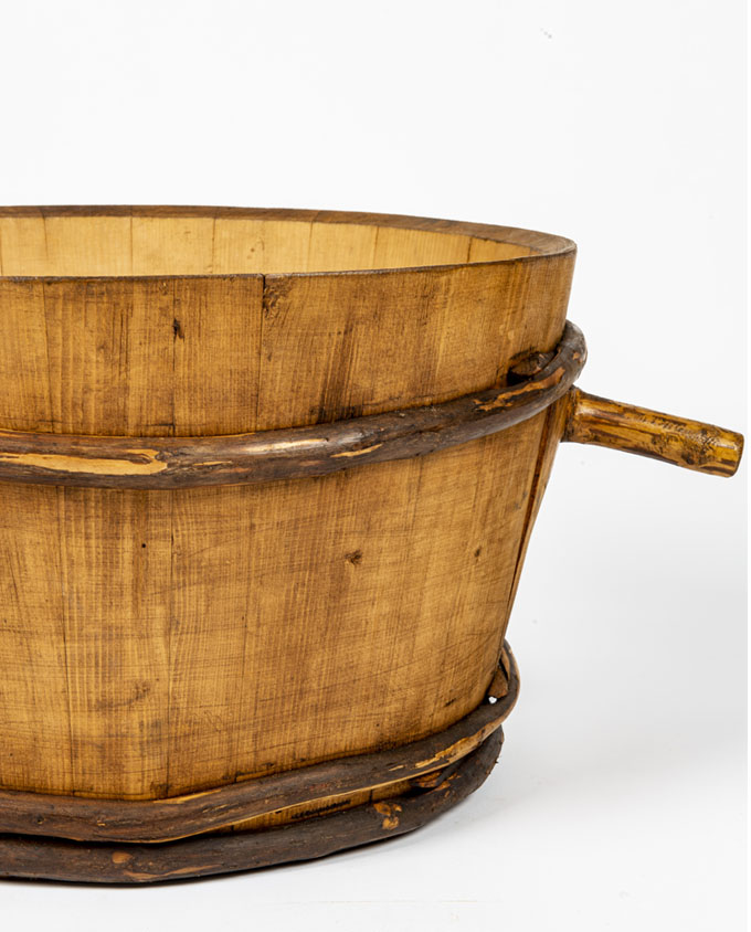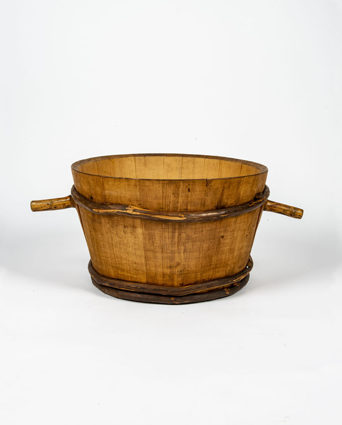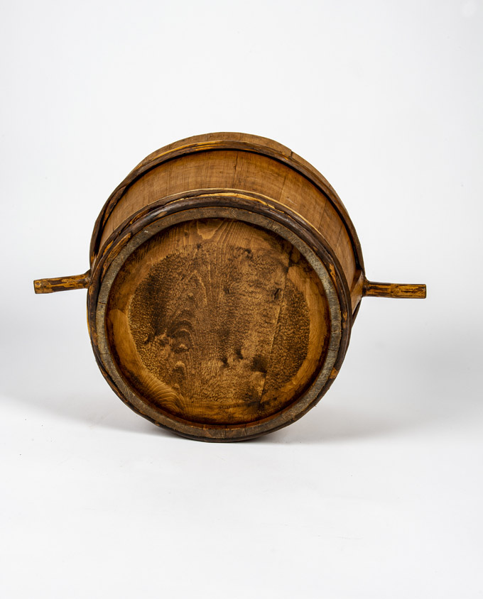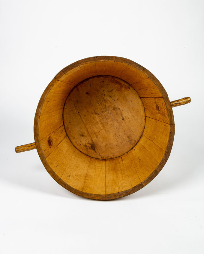 Antico mastello in legno con corpo a doghe fissate con fasce laterali. Insoliti “manici” con forme organiche modellati da rami. Proveniente dall’Alta Savoia, era utilizzato nella lavorazione del latte.
