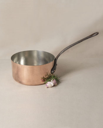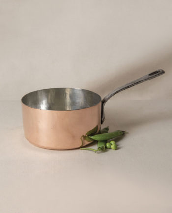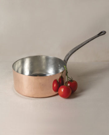 Casseruola bassa in rame stagnato leggermente svasata con manico in ferro fissato con tre rivetti in rame. Recentemente lucidata e ristagnata, è pronta all’utilizzo. Timbro: 26; provenienza: Francia. Prima metà del ‘900.