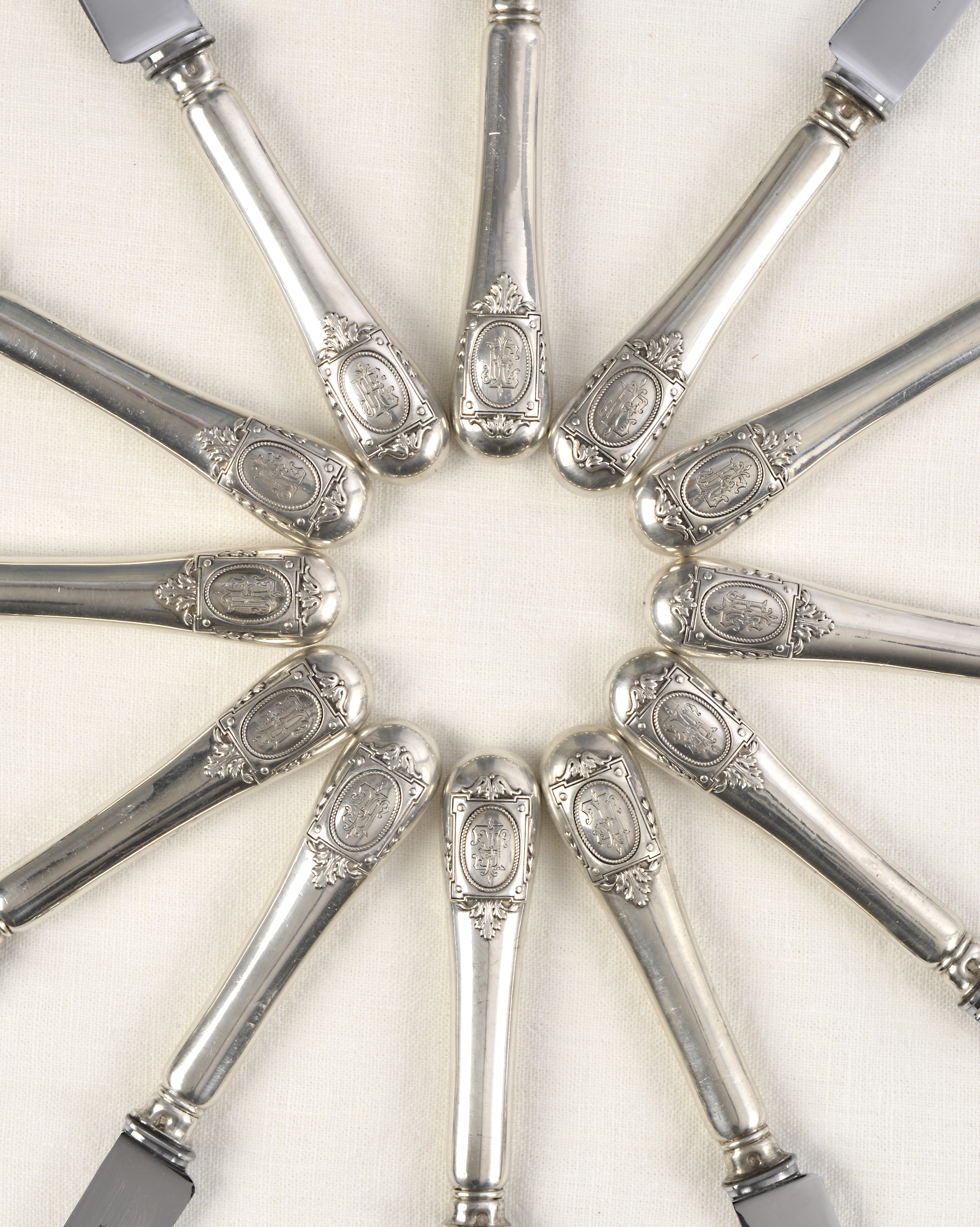 Set di dodici coltelli da pasto in argento prodotti da Henri-Louis Chenaillier. Il nome del prestigioso argentiere parigino, attivo dal 1839-1859 è impresso su ogni lama mentre il punzone (formato dalle iniziali HC con un sole levante e una stella, il tutto racchiuso in un rombo) appare sul manico, così come la testa della Minerva che costituiva la garanzia dello stato francese. Alla base dell’impugnatura si nota un fregio che contiene un monogramma inciso con le iniziali FL.