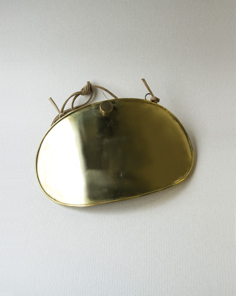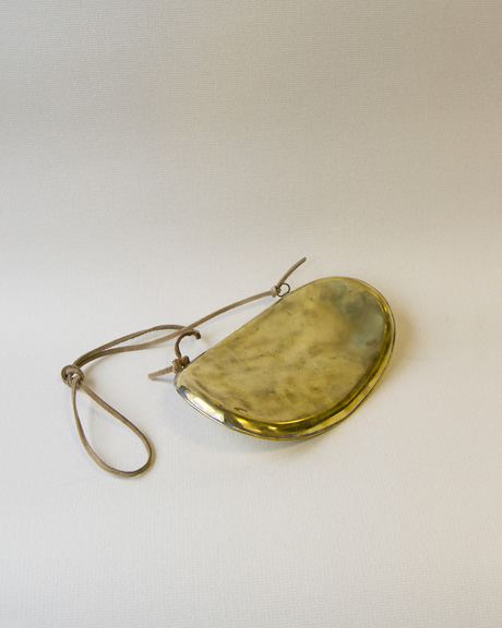 Realizzato in sottili fogli di ottone, curvati per conformarsi alla forma del corpo, questo precursore della borsa di acqua calda ha una camera cava destinata a essere riempita d’acqua attraverso una piccola apertura con tappo svitabile. Dotato di cinturini in pelle per poter essere appeso al collo, è in ottime condizioni. Un marchio di fabbrica non identificato include le iniziali H.C.